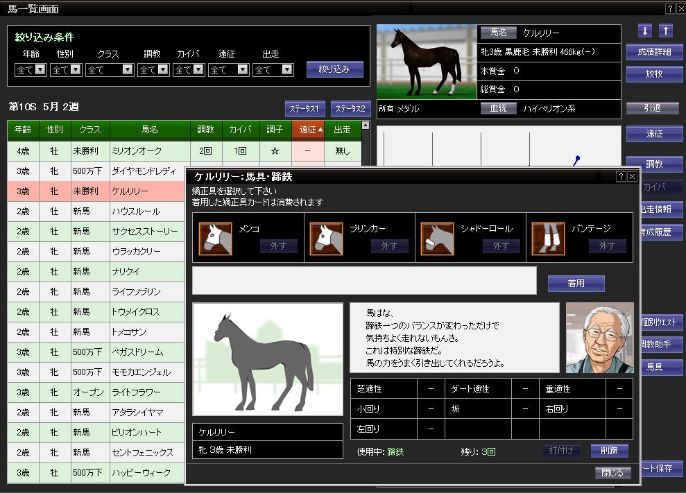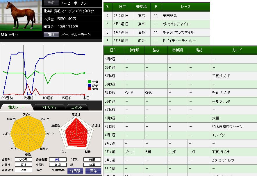 このフェブラリーS~安田記念までは調整が難しいローテで、自分のプレイ歴の中でも最もうまくいった事例です。どのような方法で調整したのかを予想してみて下さい。うまくイメージできたら、後はそれを実行すればおそらく自身の馬も一つでも多くのレースに使えるようになると思います。