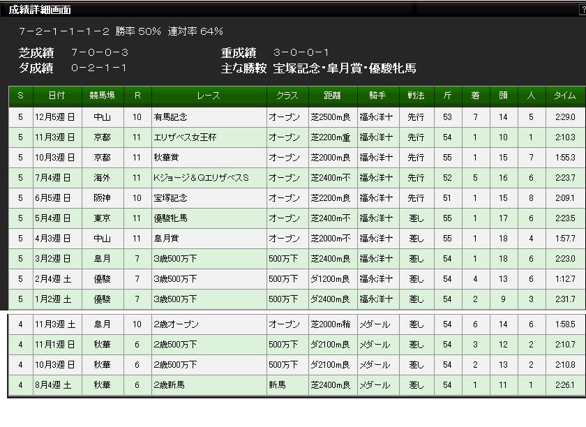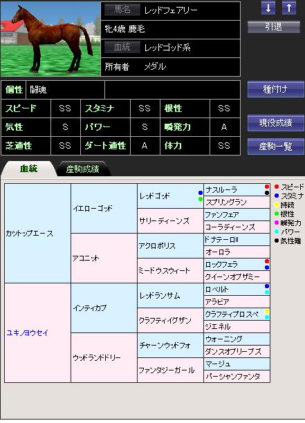 その後は有馬記念に出走するも、距離が長かったのか見せ場のない7着に沈んでしまう。結局これがラストランとなり、ターフを去った。これだけの実績がありながらも一番人気になったのは新馬戦とエリザベス女王杯の2回だけ。GⅡやGⅢには一度も出走せず、勝つ時はどんな位置でレースをしても圧勝、負ける時は不可解な大敗が多かったレッドフェアリー。その外見もレースぶりからも’’赤い妖精’’というイメージがピッタリとはまる記憶を残していった。