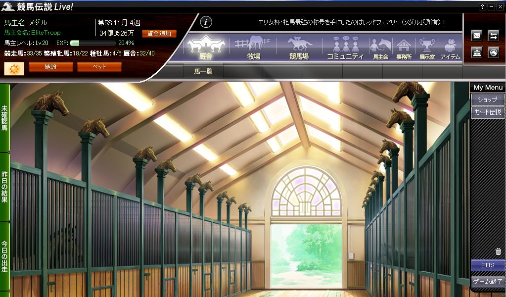 新たな会員が増え、メンバーが倍増した。シーズン半ばまでサブ会育成をしていた為それほど大きな飛躍はないよう感じるが、元リーダーの加入で経験値が大幅増。6S早々には馬主会経験値アップ特典まで手が届く勢い。新たなGⅠ馬主、OP馬主も誕生し、良いシーズンとなった。