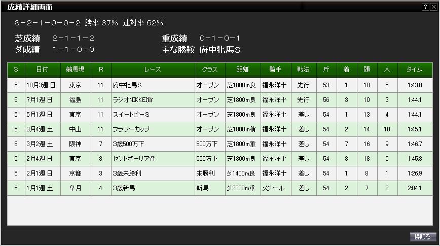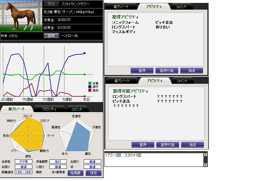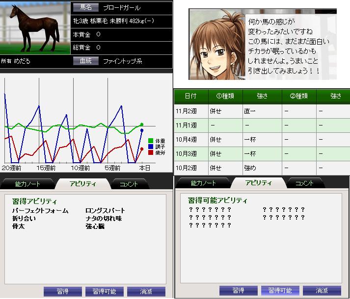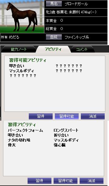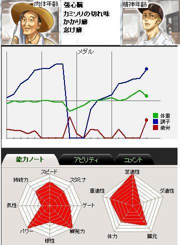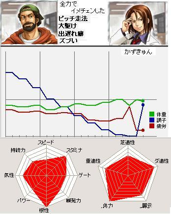 それよりも2000mを122で走ったレッドに驚いています。何せ前日の計測数本(弱気になってしまうのが嫌だから最近タイムあまり測りませんw)では3歳牝馬限定に条件を絞ったにも関わらず114-118。鉄砲補正が当日適用だったので正確な計測はできなかったわけですが、蹄鉄はフリレでもしっかり適用されるので、騎手の中距離がB→Aに変わった分と合わせても122はちょっと想像できませんでした。