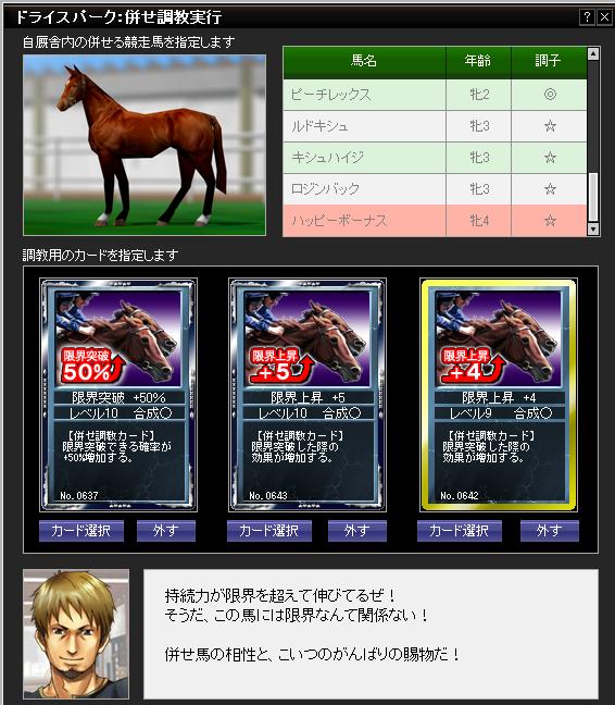 条件に応じたレースの騎乗をこなすことでステータスが上昇しますが、すべての条件をSSにする事はできず、SS SS B E E という組み合わせが上限になります。ただしこの状態はSSの内部数値が上限までいっていない可能性があるので、SS SS C E Eが理想だと思われます。