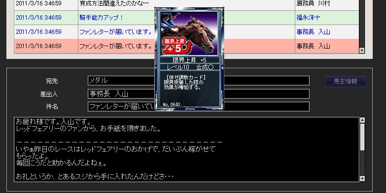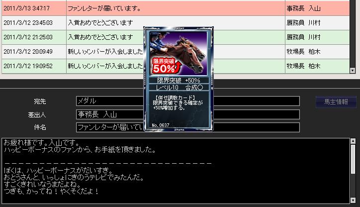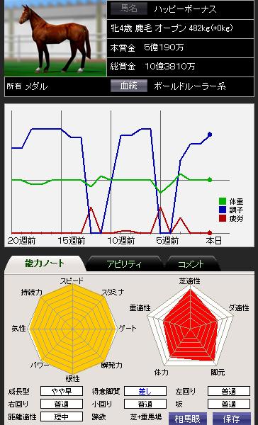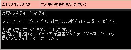 昨日に続いて30%+8に失敗。入厩後間もないのとコンディションが上がっていない事もあるが、半姉レッドフェアリーと比べて突破への器用さ(というか運w)は劣るか。ただしアビリティを取得し、個性が判明したのはプラス材料。