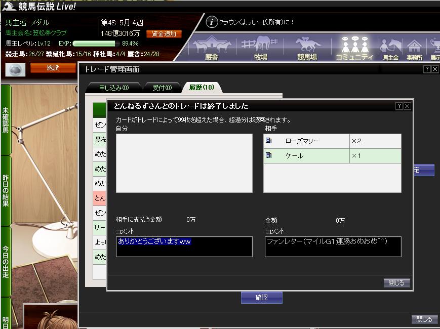 持ち馬の相次ぐ引退から第4Sは大きく出遅れてしまった(もっとも、引退させたのは自分なんだがw)メダルですが、ここにきてようやくサブアカウントや会経験値用の無料アカウントも勝ち始めてきました。